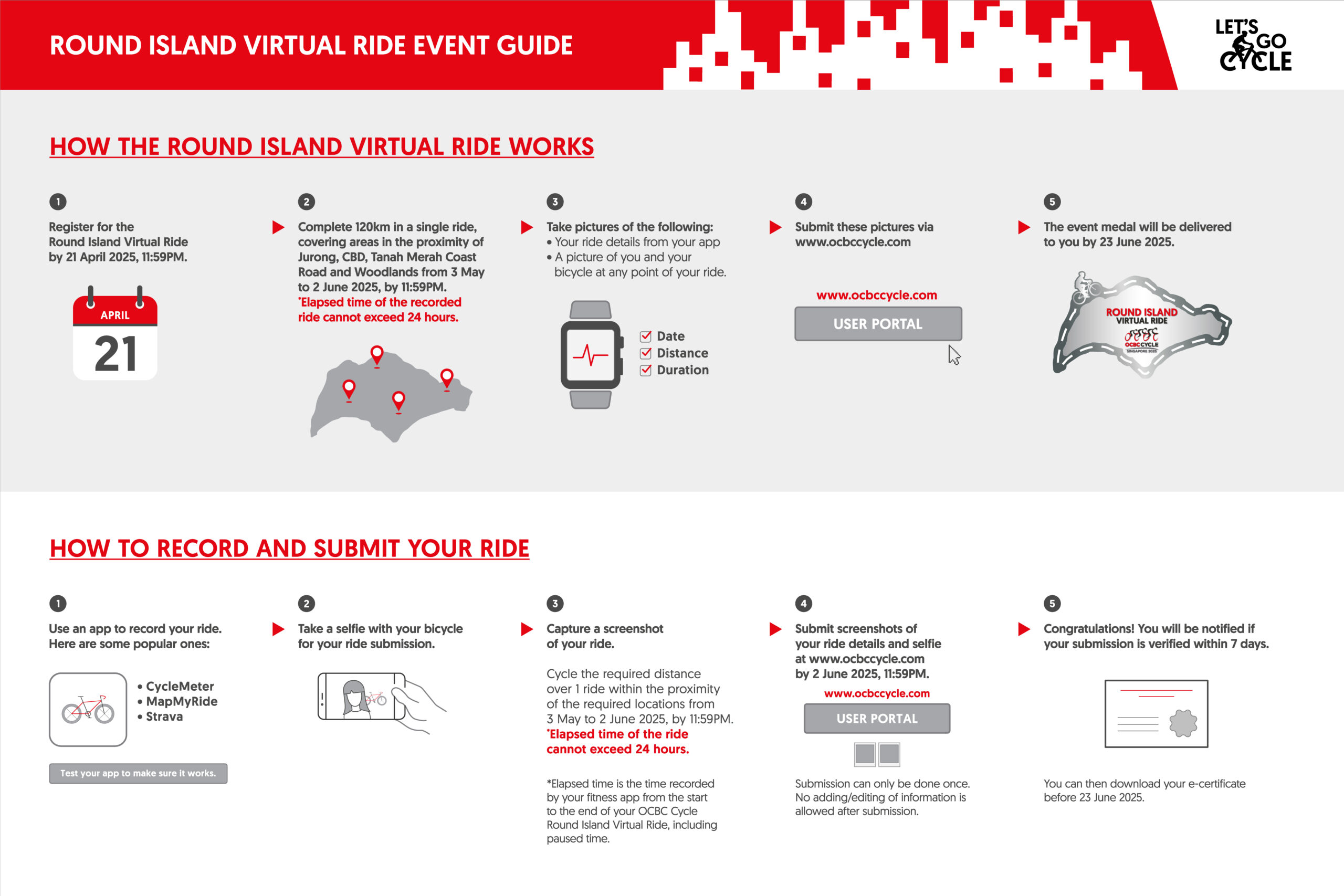 - You only have one attempt to submit these pictures via the user portal at www.register.ocbccycle.com by 8 June 2026 to indicate that you have completed your virtual ride.